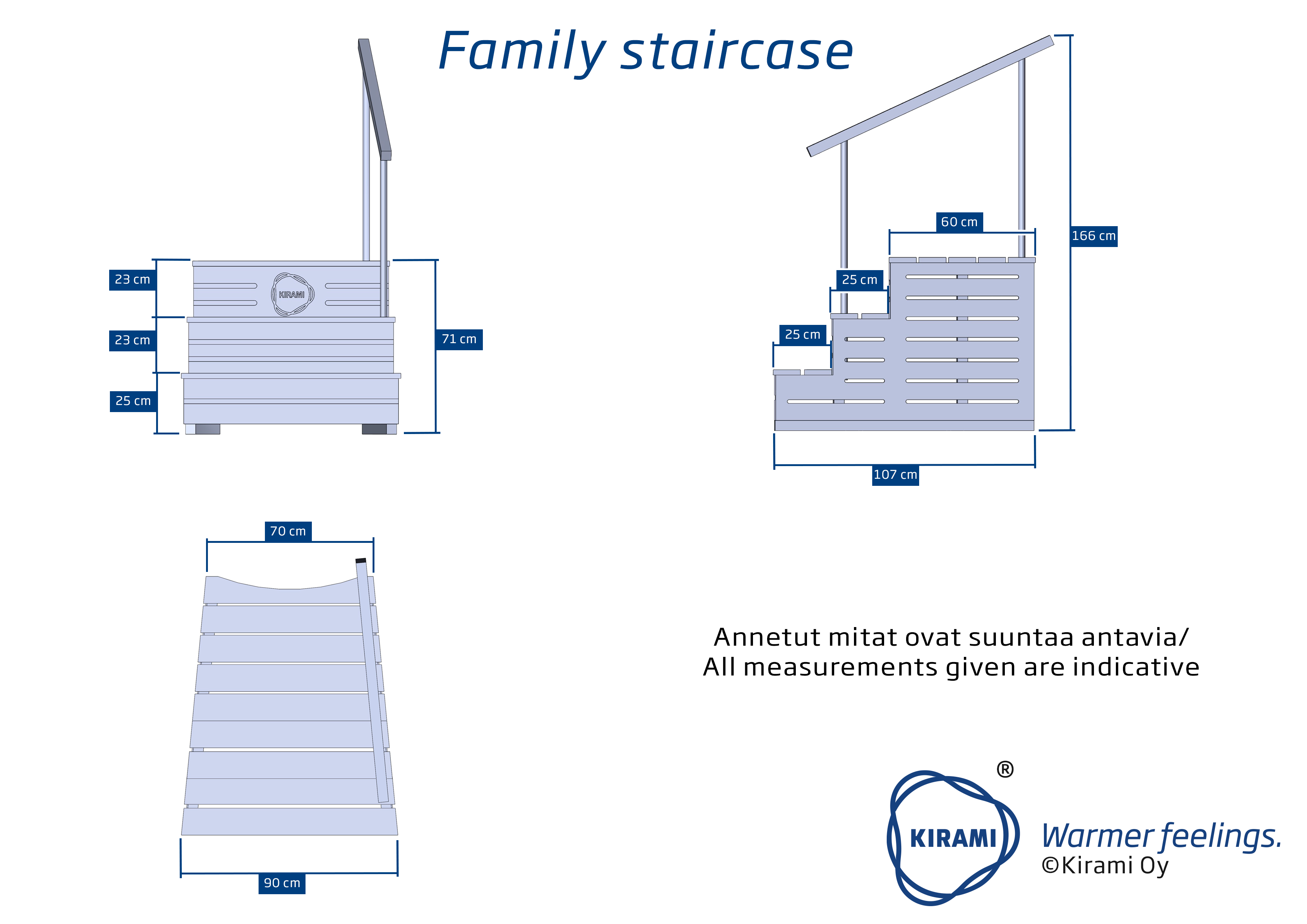 Trap van 71 cm hoog, ontworpen voor Family-baden met een 85 cm hoge leuning om gemakkelijk in en uit te stappen. De treden zijn stevig en zo groot dat u er gemakkelijk uw pantoffels op kunt laten staan tijdens het baden. De trap is tegelijkertijd ontworpen als houder voor een klein massafilter, zodat het filter beschermd wordt tegen het weer en verborgen blijft.