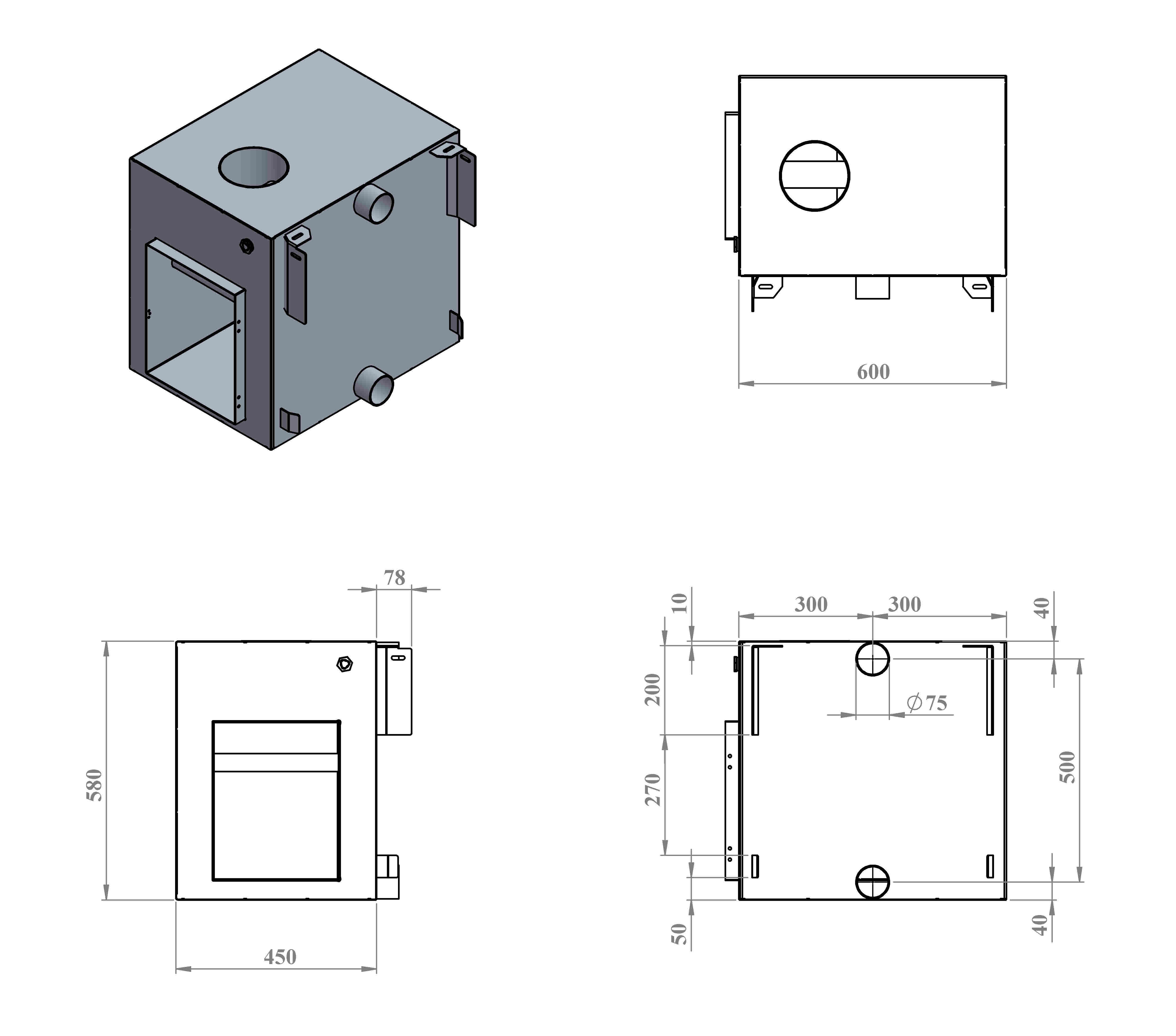 - Buitenafmetingen: breedte 570 mm, lengte 600 mm