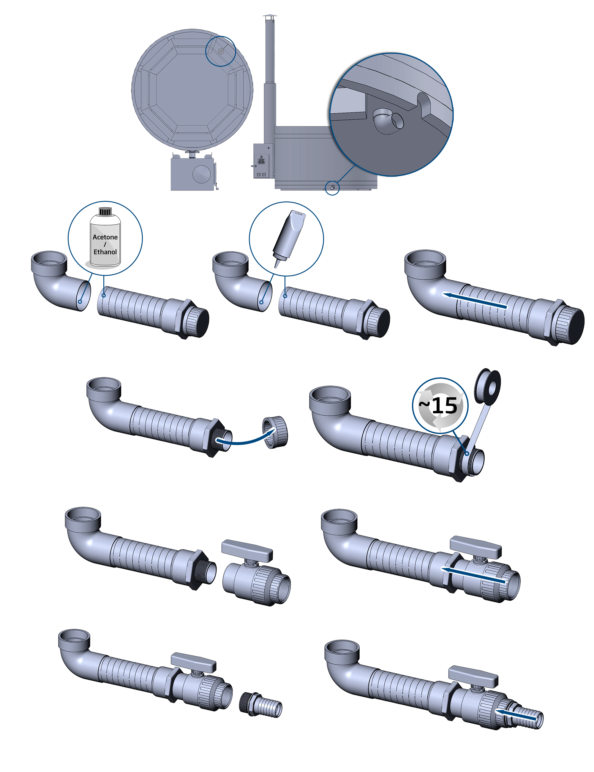 Verlengstukset voor de afvoer van Woody hottubs. Hiermee kunt u de hottub vanaf de buitenkant afsluiten en op de kraan zit ook een slangkoppeling, die geschikt is voor een aparte slang met een binnendiameter van 38 of 32 mm. De aansluitslang van de set met een buitendiameter van 50 mm moet met de meegeleverde pvc-lijm aan het hoekstuk van de afvoer onder de hottub worden gelijmd. De slang is zo gedimensioneerd dat de kraan op gepaste afstand buiten de wand van de Woody-hottub komt.