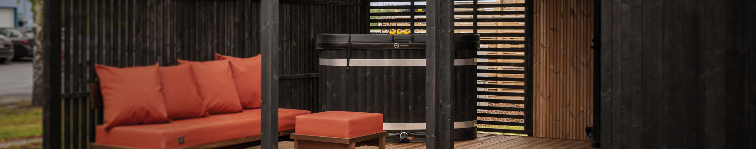 De buitenmantel is gemaakt van gladde panelen van hittebehandeld zachthout. De hittebehandeling beschermt het hout tegen rotten en zorgt ervoor dat het bij vocht minder krimpt en uitzet. Het stijlvolle diepzwarte thermohout met oppervlaktebehandeling is duurzaam, en de verf beschermt het hout tegen vuil en uv-stralen. Hetzelfde recyclebare en onderhoudsvriendelijke materiaal wordt ook gebruikt voor de Kirami FinVision® Misty -modules. Dankzij hun identieke buitenbekleding passen de hottub en sauna perfect bij elkaar. Als interne kleur fluweelzacht, “goudgetint”, doorschijnend lichtgrijs. Deze tijdloze en trendy grijze kleur is stijlvol en perfect passend in alle tuinen.
