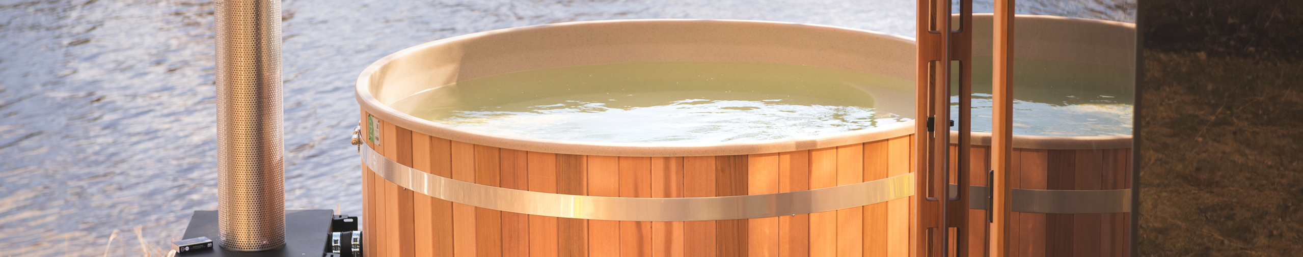 Als warmtebron de effectieve, tijdloos vormgegeven, zwarte Cube-kachel, die ook een grotere hottub snel opwarmt. Gemaakt van eersteklas, zeer goed warmtegeleidend, zeewaterbestendig aluminium.