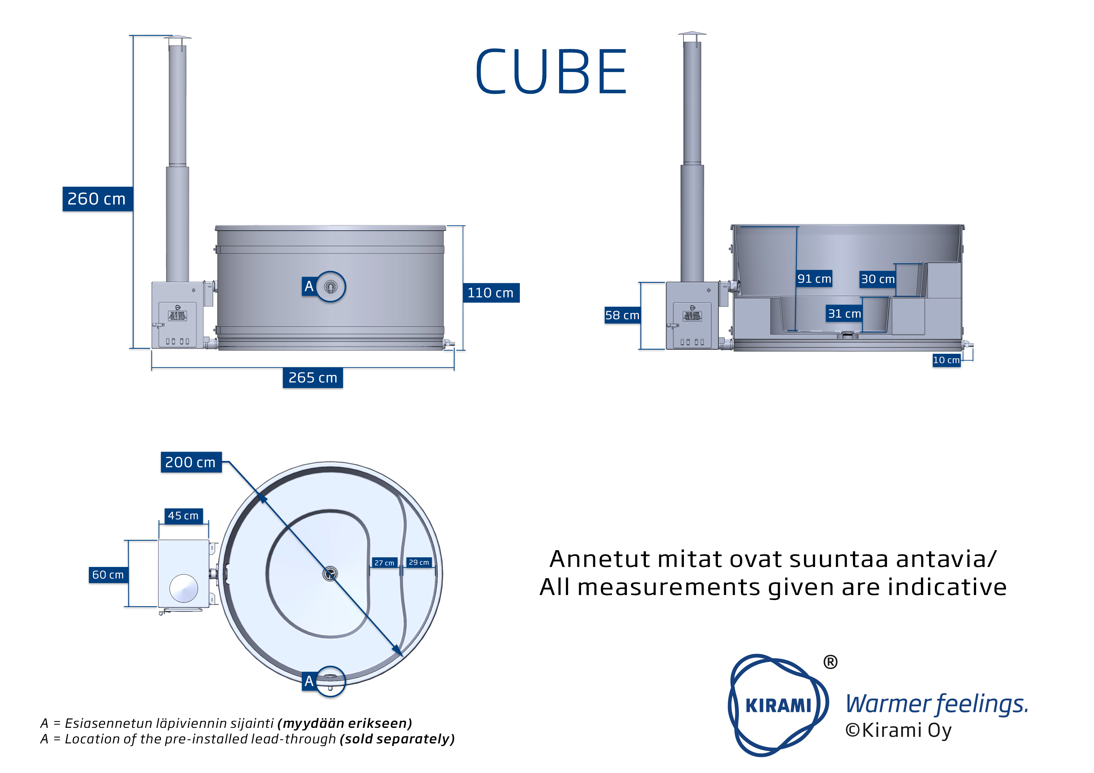 De kuipdoorsnede is 200 en het watervolume 1930 liter. Hij is geschikt voor 6-8 personen. Het lege gewicht van de hottub is 180 kg. Het bruto warmtevermogen van de CUBE-kachel is 48 kW en het netto warmtevermogen dat naar het water wordt overgedragen is 35 kW.