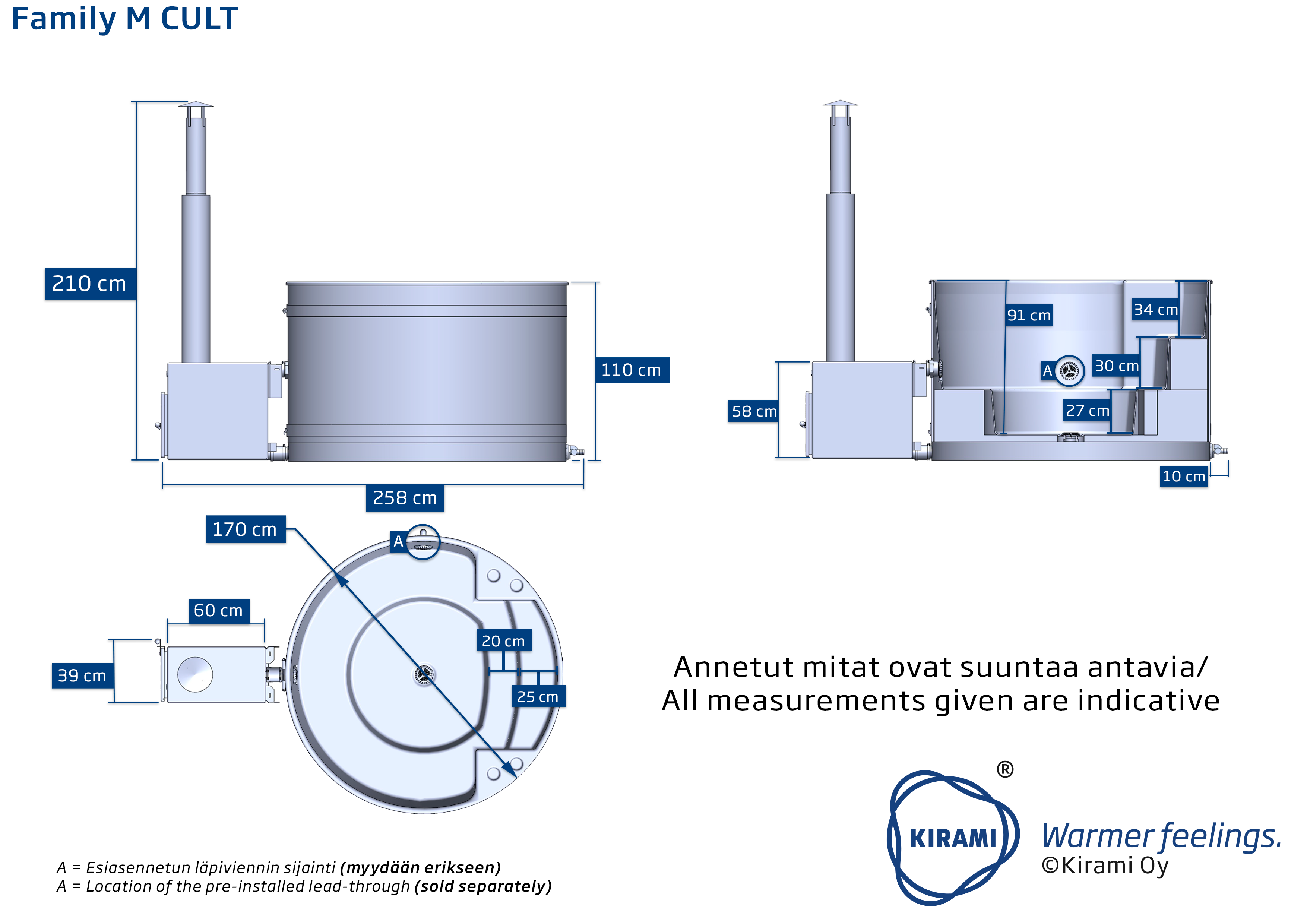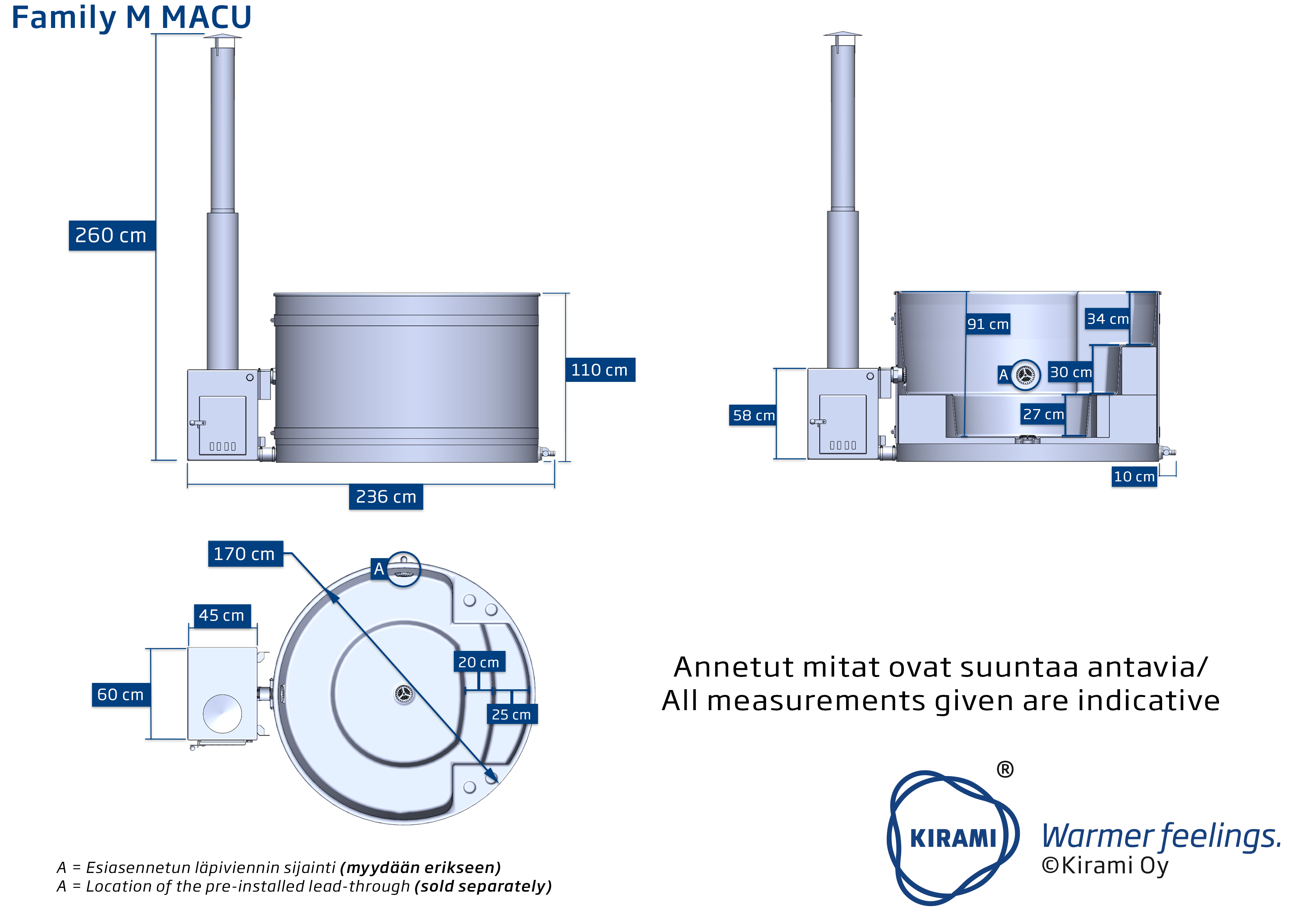 De kuipdoorsnede is 170 en het watervolume 1370 liter. Hij is geschikt voor 3-5 personen. Het lege gewicht van de hottub is 130 kg. Het bruto warmtevermogen van de MACU-kachel is 40 kW en het netto warmtevermogen dat naar het water wordt overgedragen is 29 kW.