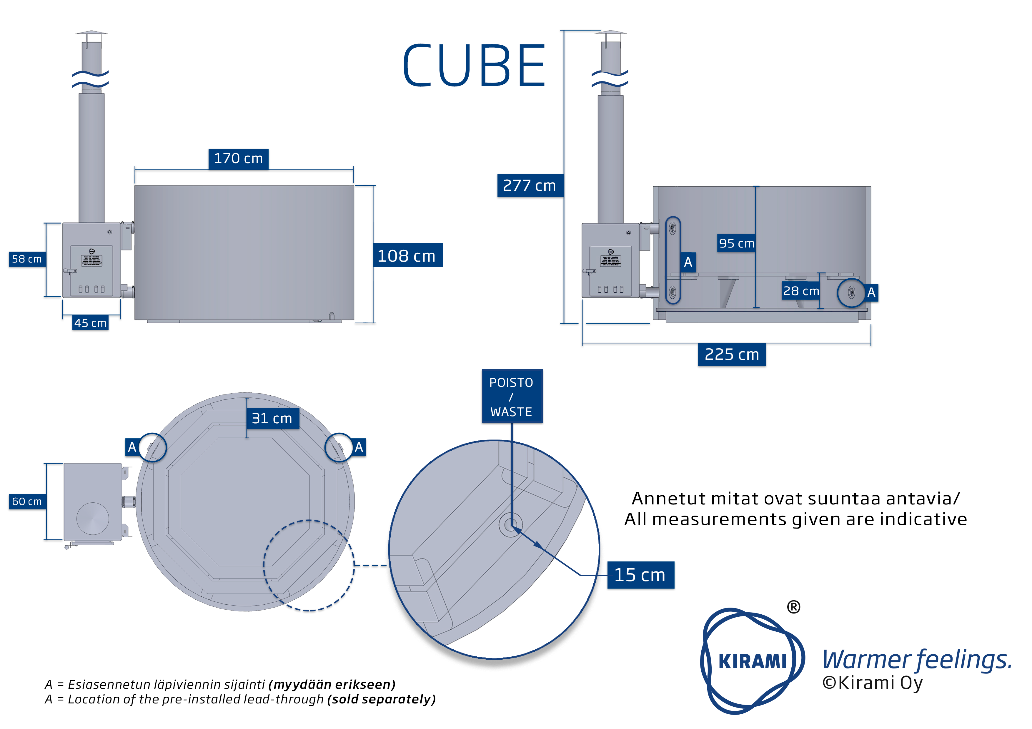 De kuipdoorsnede is 170 en het watervolume 1860 liter. Hij is geschikt voor 4-6 personen. Het lege gewicht van de hottub is 209 kg. Het bruto warmtevermogen van de CUBE-kachel is 48 kW en het netto warmtevermogen dat naar het water wordt overgedragen is 35 kW.