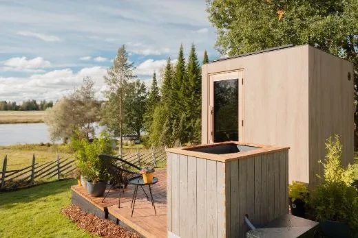 De buitenaankleding is van warmtebehandeld dennenhout, met een oppervlak van grijs geverfde en geborstelde panelen. De hoeken van het bad zijn elegant afgewerkt met vingergewrichten die ze naadloos met elkaar verbinden. Aan de bovenkant van het bad is er een aparte rand van warmtebehandeld dennenhout die het bad en de buitenlaag naadloos met elkaar verbindt. Deze rand is behandeld met kleurloze olie. Thermowood is een duurzaam en hoogwaardig materiaal dat mooi zijn vorm behoudt. Het binnenoppervlak is van donkergrijs onderhoudsvriendelijk plastic. Het tijdloze en trendy grijs past mooi bij bijna alle buitenruimtes.